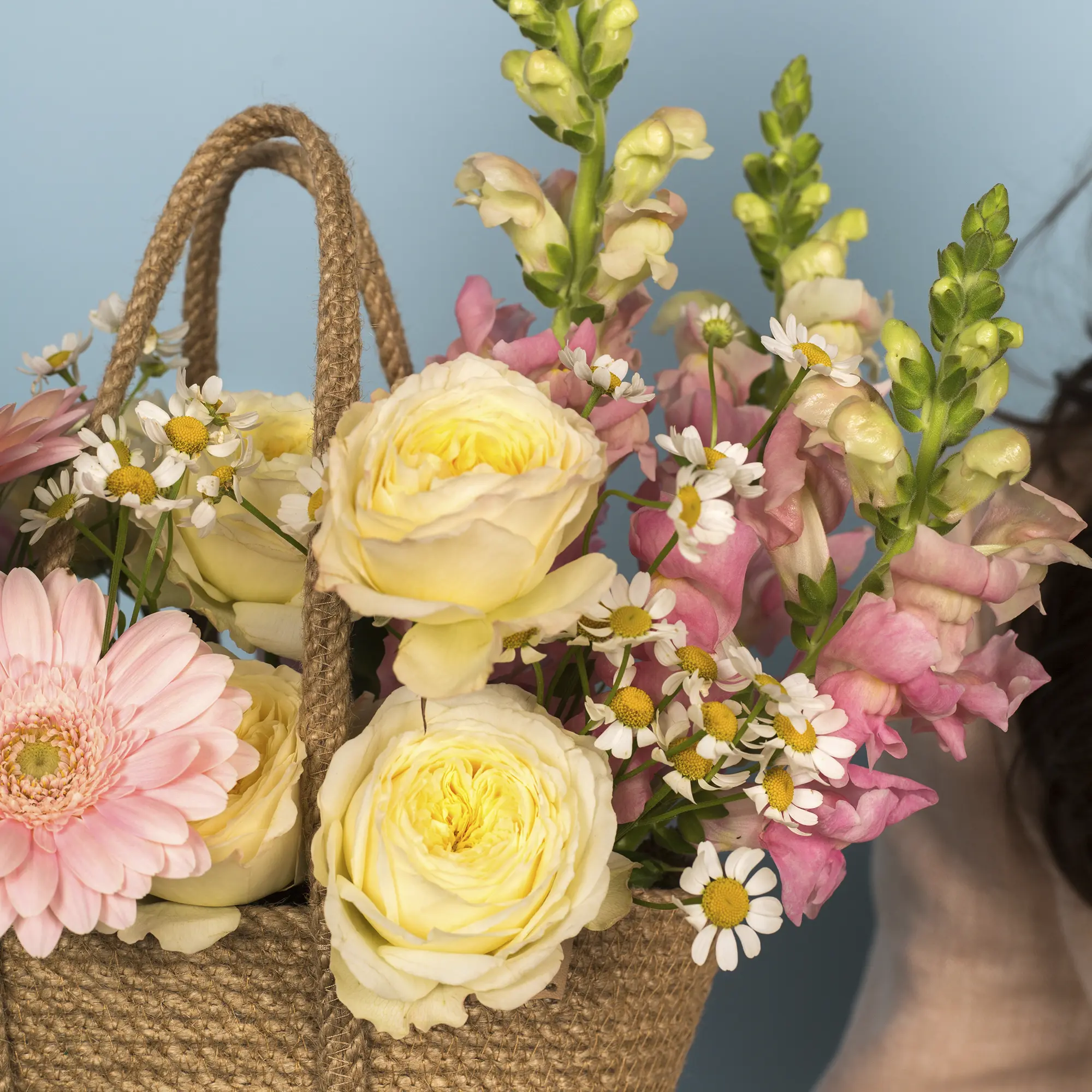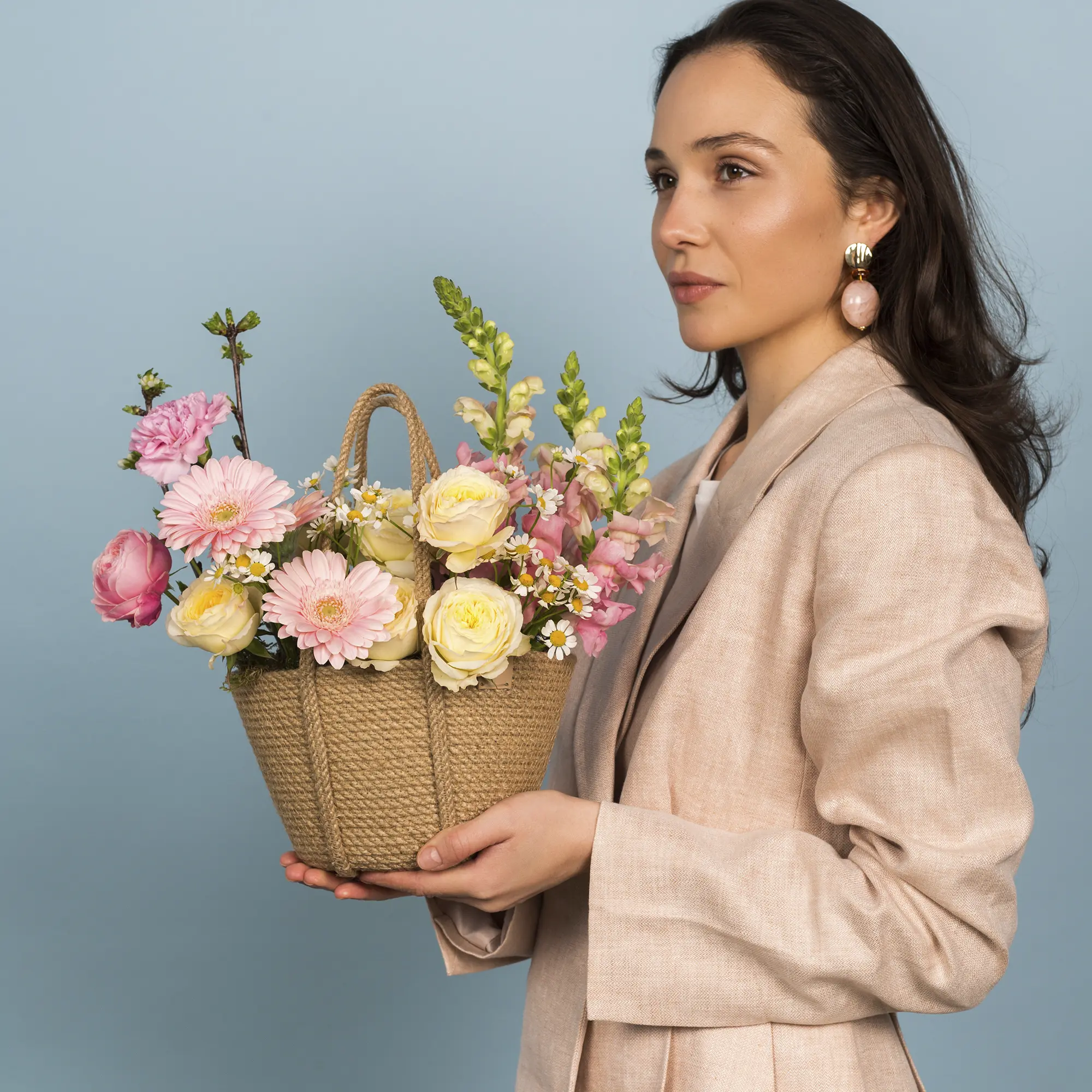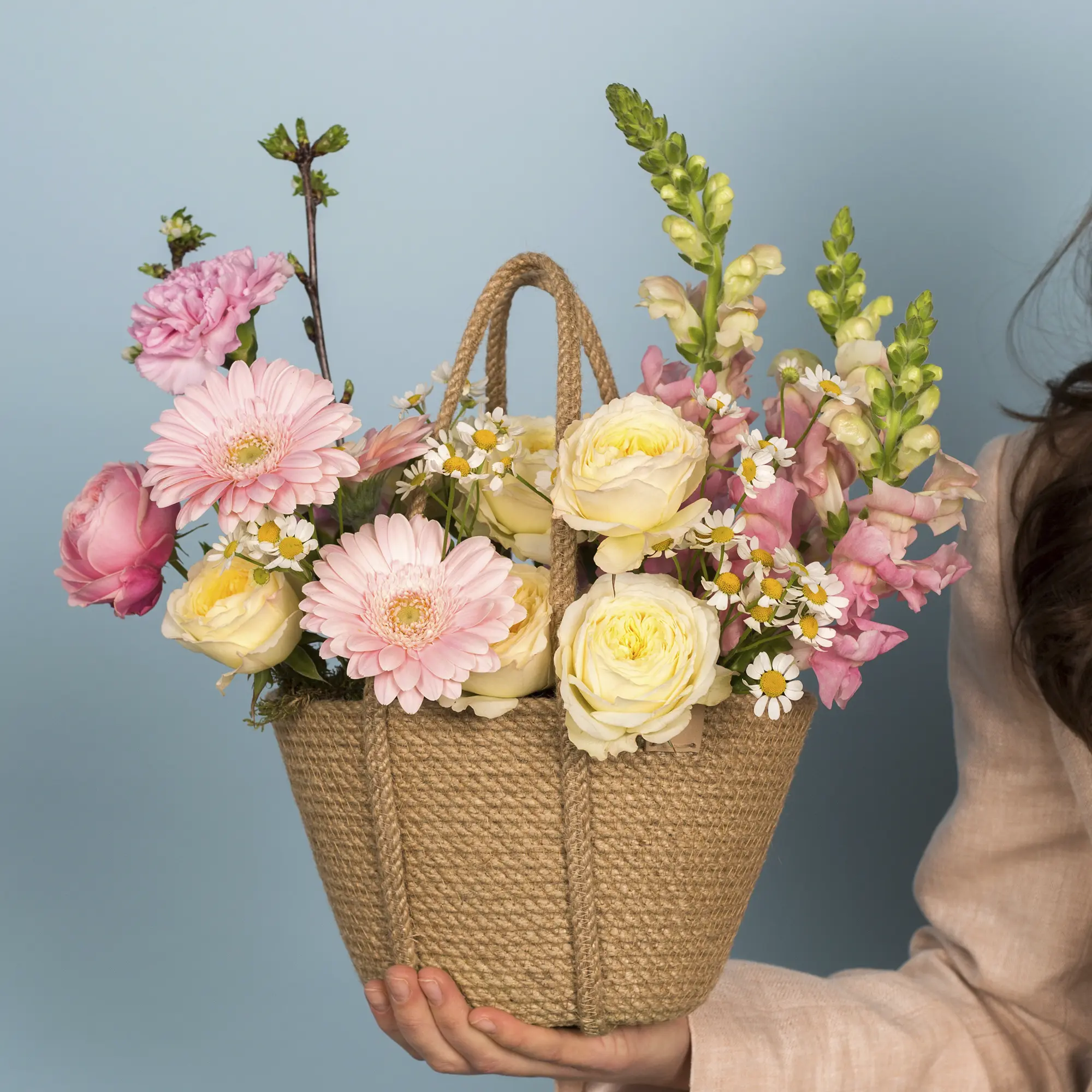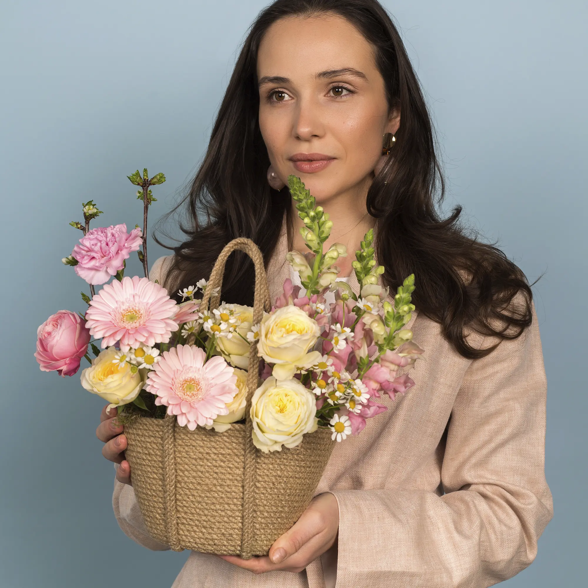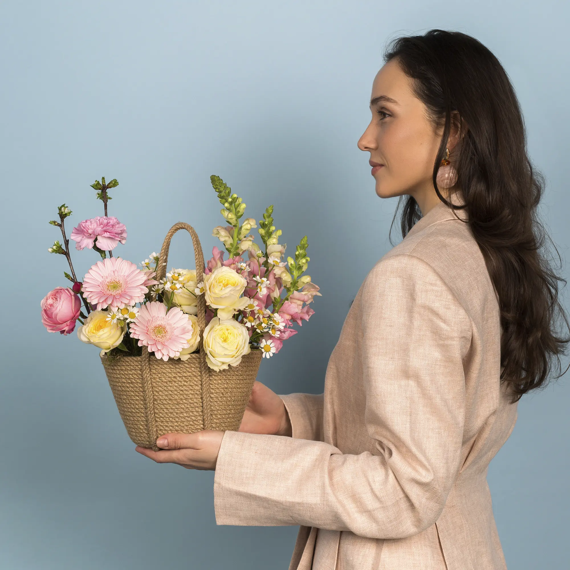 Корзинка с гвоздиками, розами и гермини №2412 среднего размера
