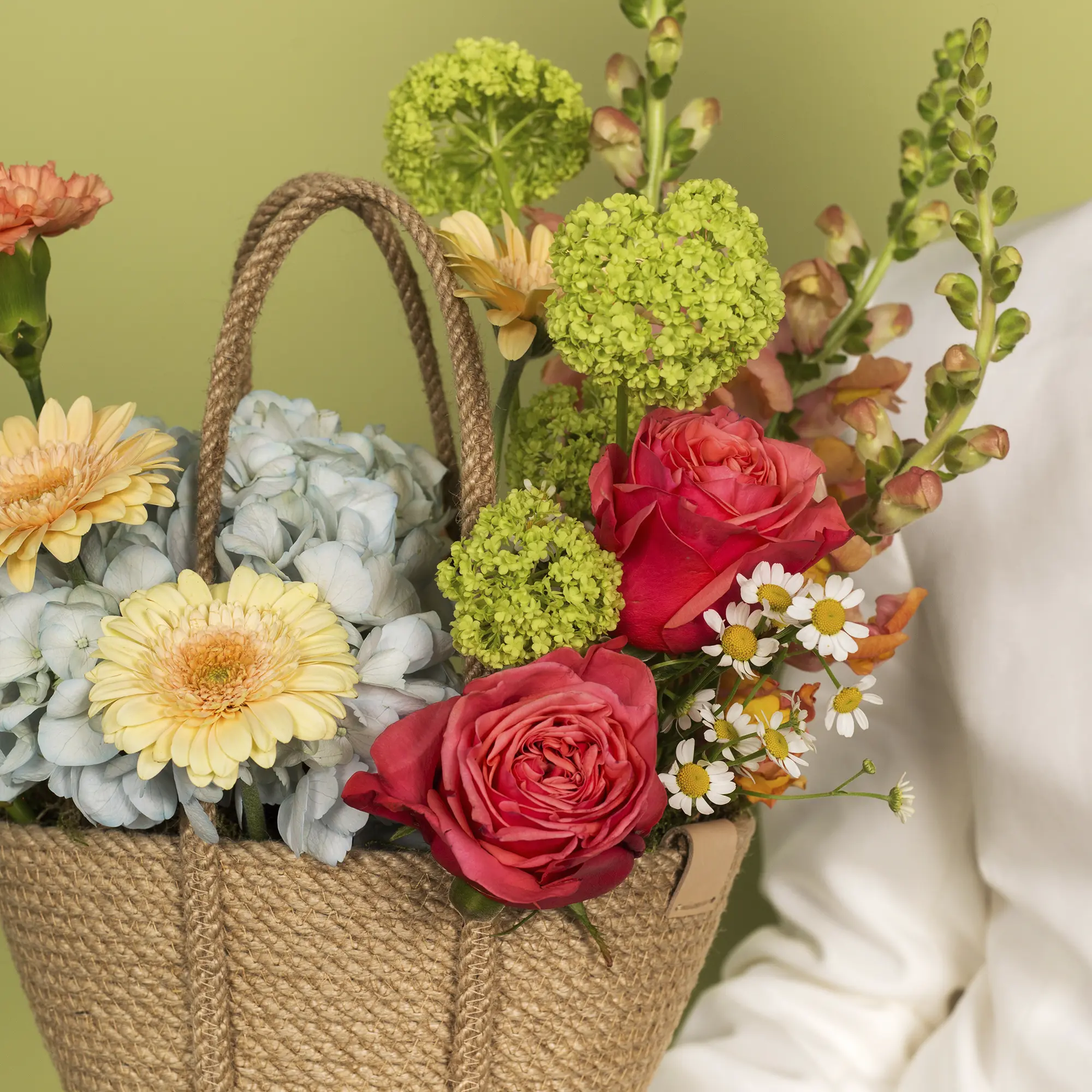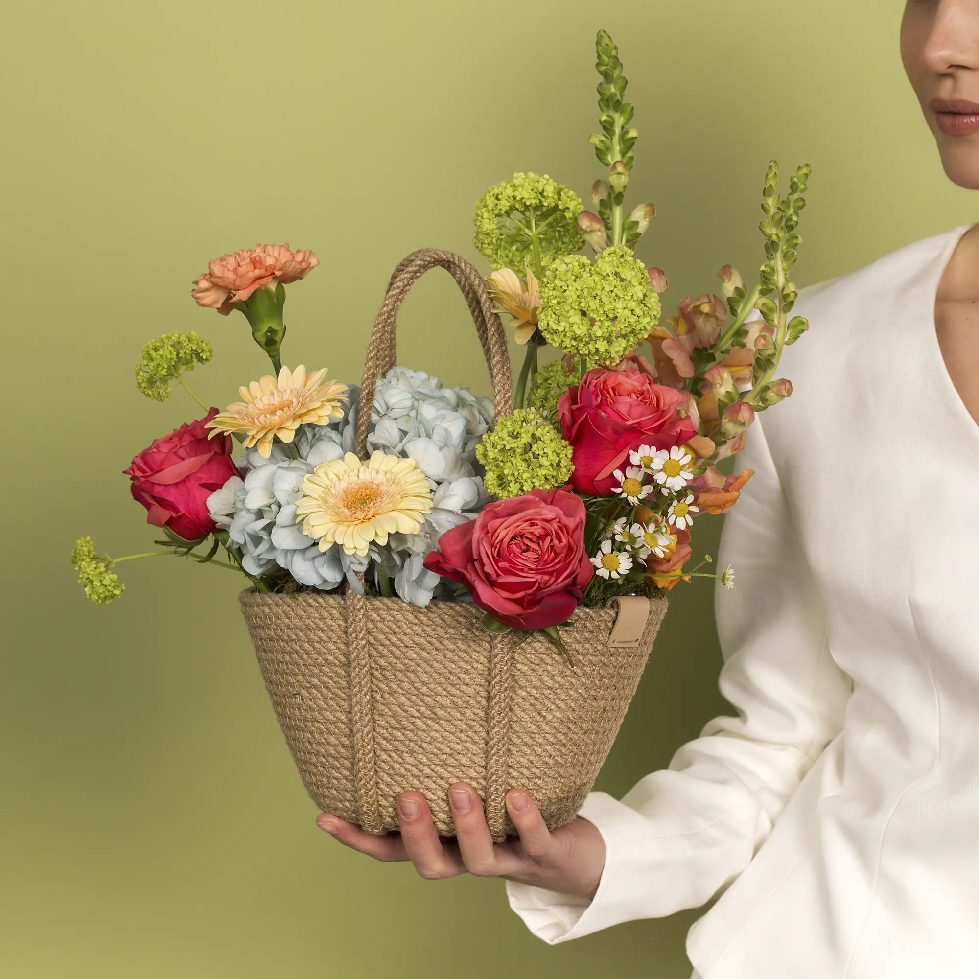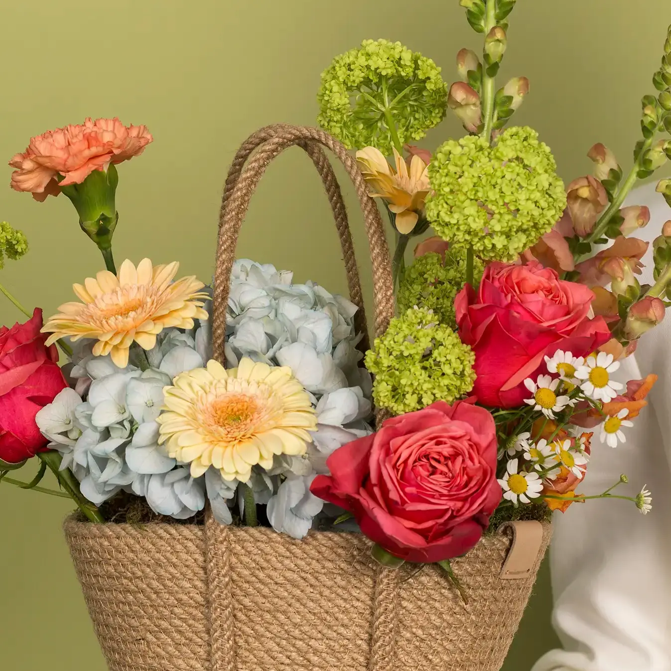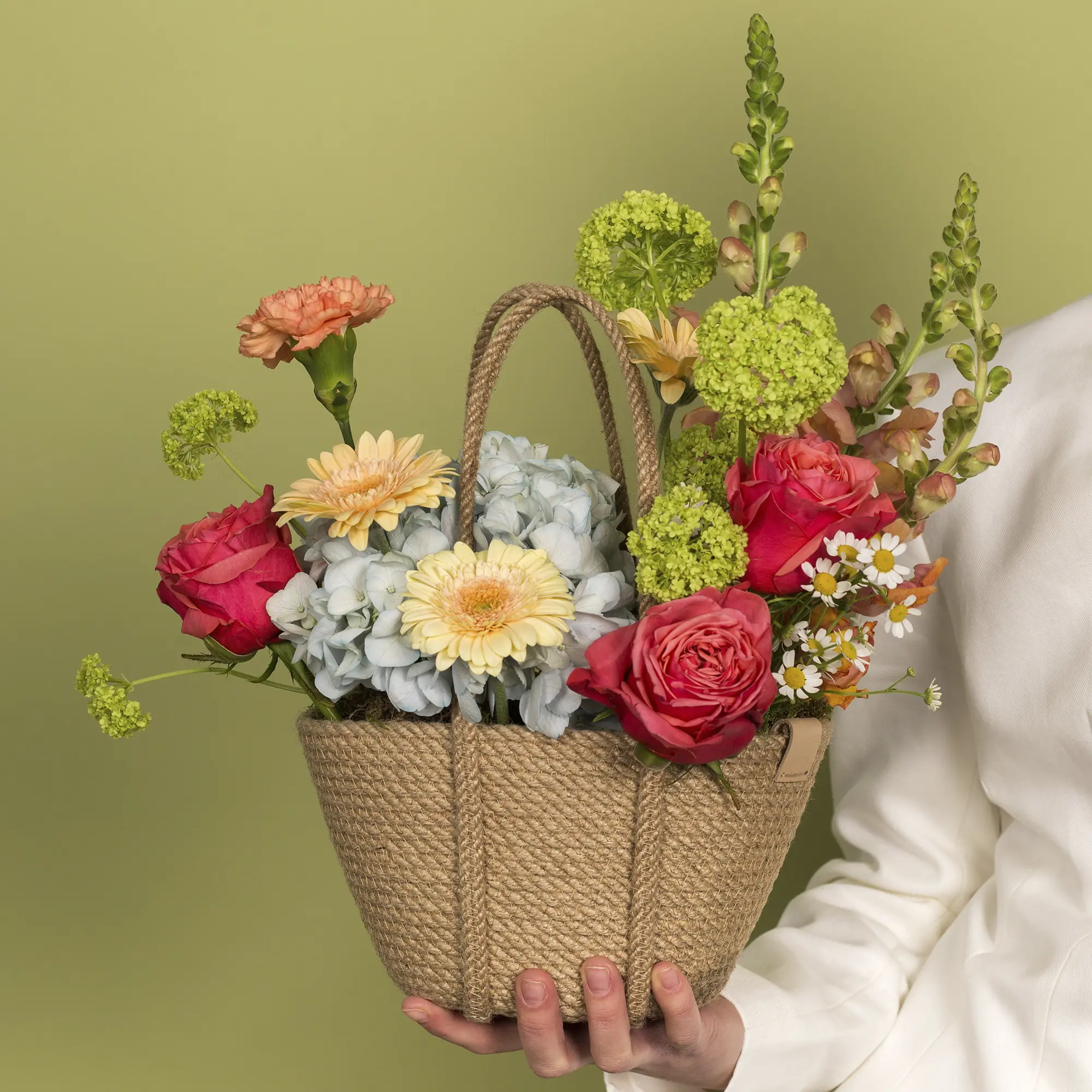 Корзинка с гвоздиками, розами и гортензией №2413 среднего размера