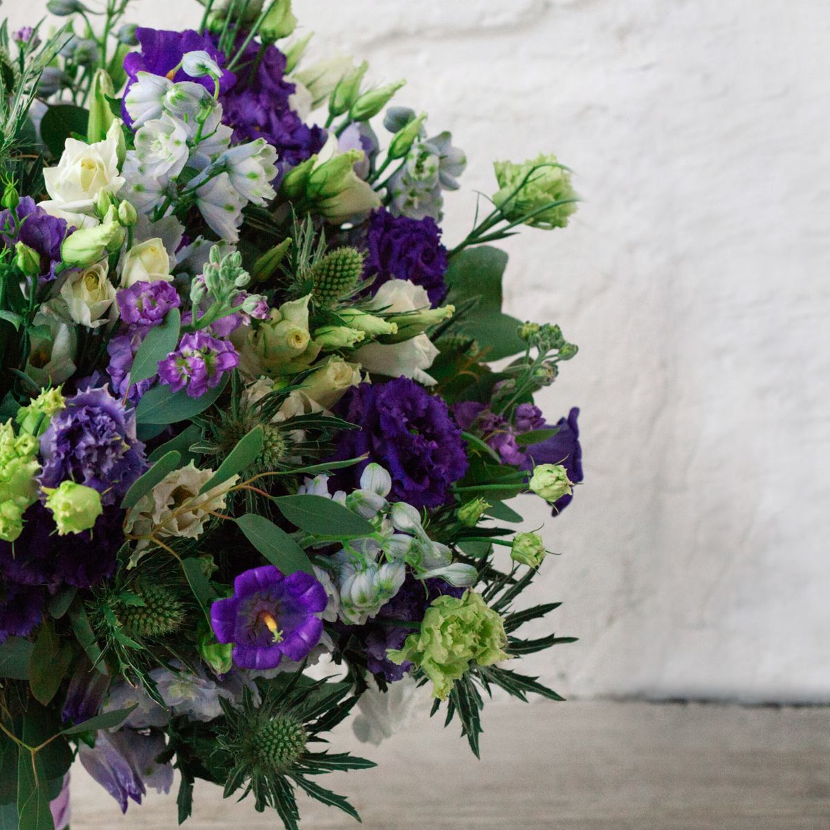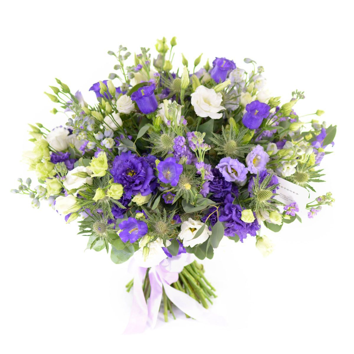 Весенний букет из ароматных эустом, маттиол, кампанулы с эрингиумом и дельфиниумом — нежное сочетание, которым можно поздравить любимую девушку с 8 Марта, 14 февраля или преподнести мужчине. Свежие цветы с веточкой эвкалипта выглядят мило и просто и не требуют упаковки. Достаточно собрать их атласной лентой розового оттенка и красиво вручить подарок, написав поздравления на открытке. Купить цветки к событию или без повода можно в каталоге интернет-магазина. Для этого выберите заказ по размеру, цене и посмотрите фото. После этого оформите доставку композиции к празднику в любом количестве.