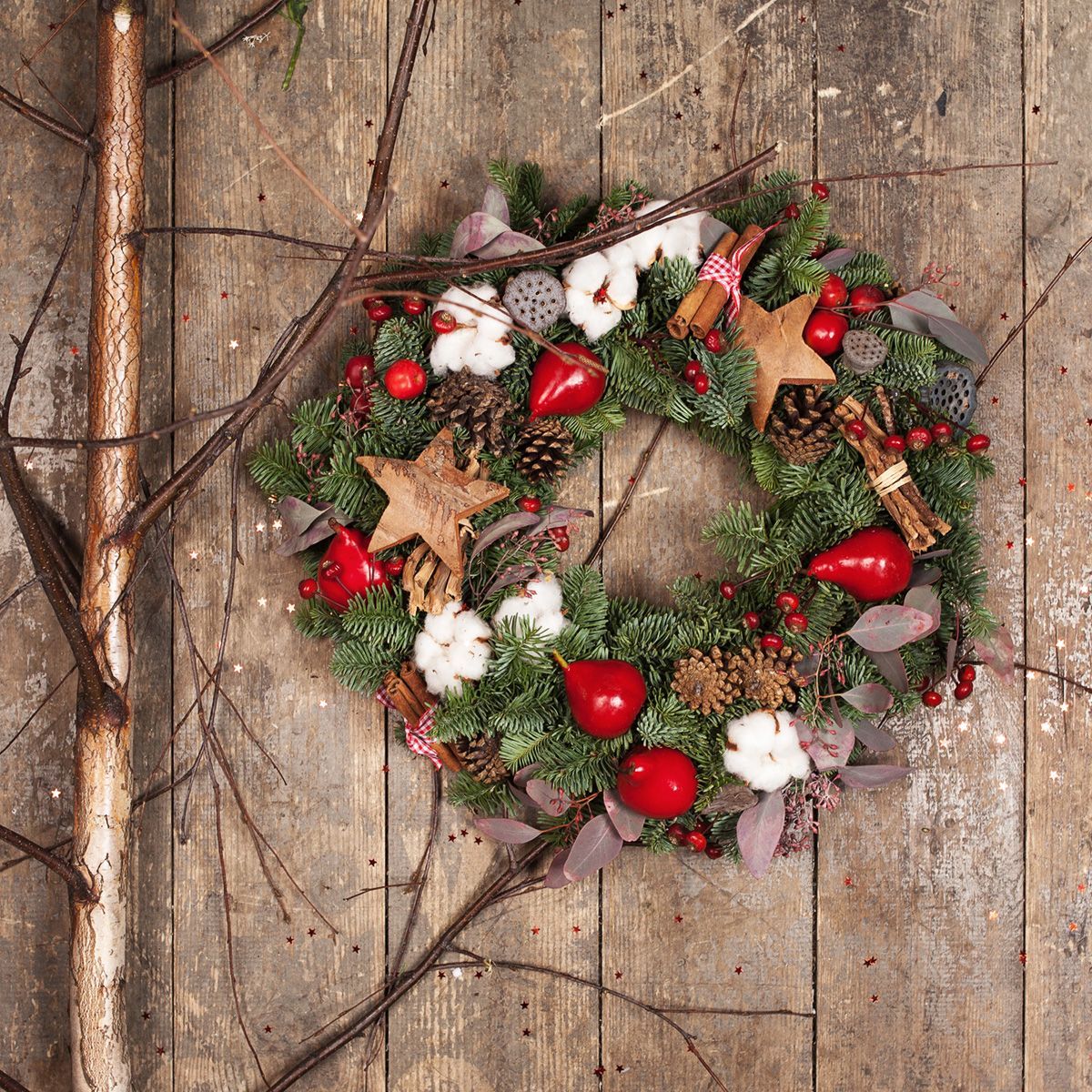 Настоящий новогодний венок — мечта практически каждого, кто смотрел американские праздничные фильмы на Рождество. Композиция из лапника, оформленная хлопком, шиповником, эвкалиптом и шишками, отлично дополнит интерьер любого дома перед Новым годом. Ярко-красные оттенки букета гармонируют с декором из дерева и еловыми лапками — такое зимнее украшение станет одной из главных деталей квартиры и создаст необходимую атмосферу уюта. Вы можете разместить его на двери или стене, а также положить на новогодний стол. Преподнести украшение можно в качестве подарка вместо традиционных цветов в упаковке или елочных игрушек. Если вы оценили сочетание на фото, то выбирайте размер и оформляйте заказ!