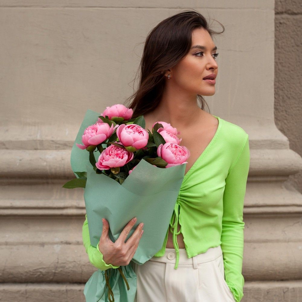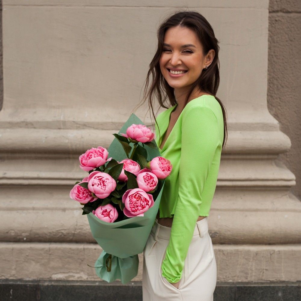 Стильная, лаконичная и эффектная композиция из роскошных пионов насыщенного розового оттенка. Бутоны особенно колоритно выглядят на фоне контрастного нежно-бирюзового оформления и натуральной изумрудной зелени. Отличный вариант для приятного комплимента, красивого поздравления или просто знака внимания без привязки к дате и дням календаря. Работа выполнена в универсальном среднем размере, подойдет и для сюрприза, и для гармоничного украшения интерьера в современном стиле. Отличный вариант для романтических признаний.