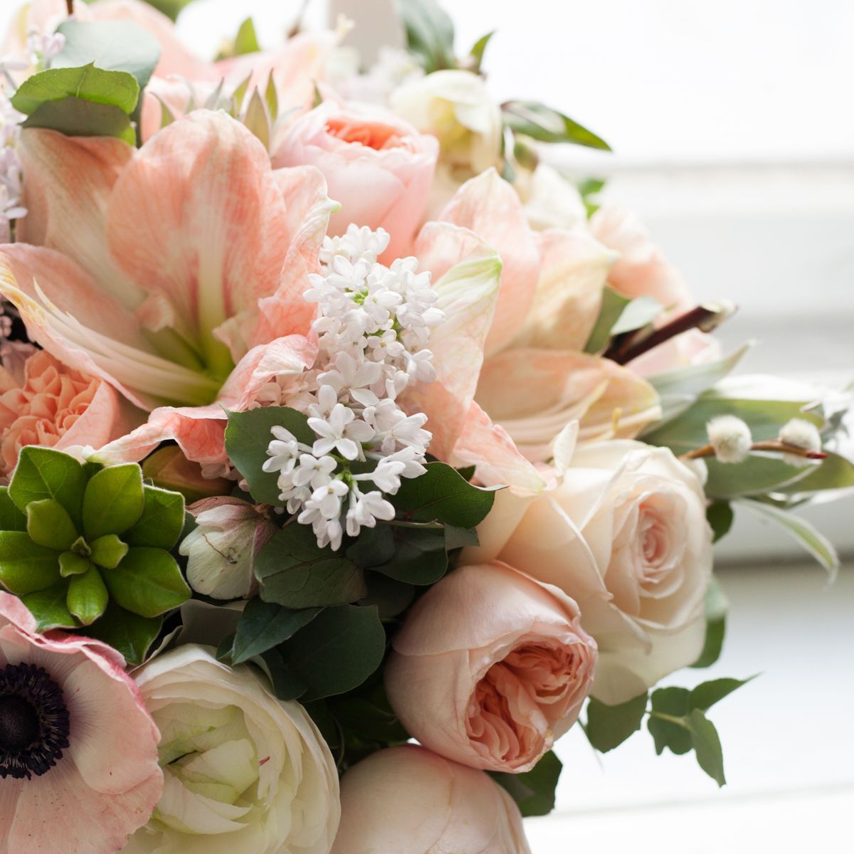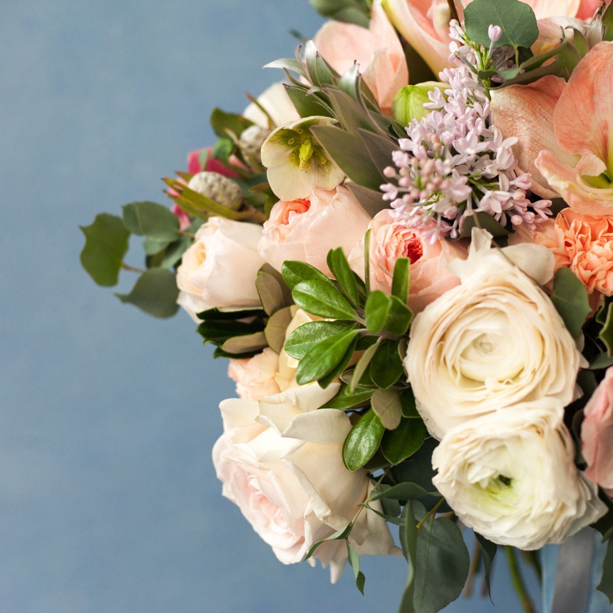 Букет из роз, ранункулюсов, сирени №448 среднего размера
