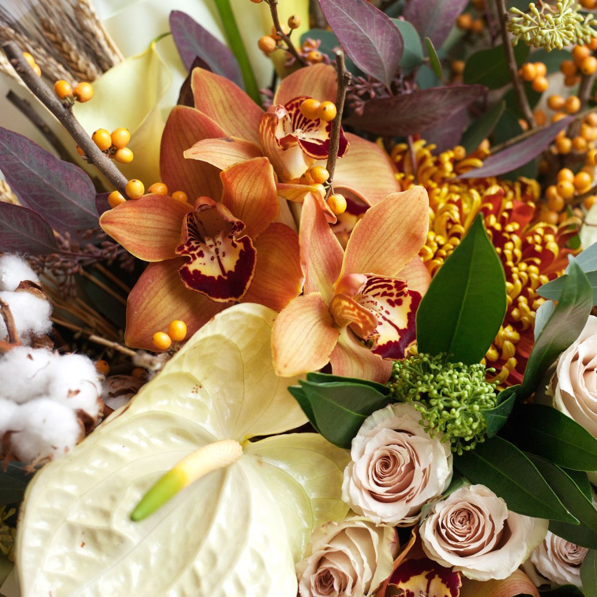 Эффектный, стильный, презентабельный букет, созданный чтобы восхищать и покорять сердца. Это отличный выбор для тех, кто ценит креативные дизайны в современной флористике, необычные сочетания цветов и яркие акценты. В работе использованы изящные орхидеи, нежные голландские розы, каллы, хризантемы, эффектный антуриум, пышная кортадерия. Декоративную роль играет хлопок с объемными белоснежными шапками. Композиция представлена в большом размере, станет достойным украшением любого торжества, мероприятия, важного события в жизни.