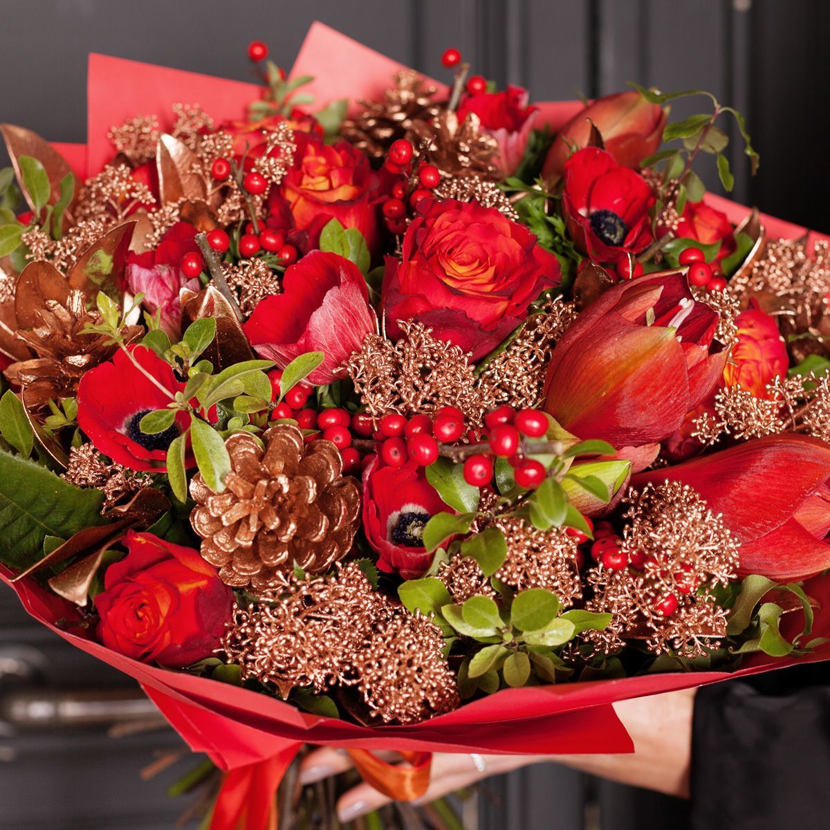 Новый год и Рождество — отличный повод порадовать любимую маму, сестру или девушку ярким сочетанием цветов. Для этого подойдет композиция в красных оттенках, которая совмещает пышные амариллисы и анемоны, изысканные эквадорские розы и илексы. В качестве дополнительного украшения выбраны шишки, которые идеально подходят для елочного декора. Новогодний букет дополняет алая упаковка с атласной лентой, усиливающая впечатление от цветочного ансамбля. Подарок согреет своим теплом и уютом получательницу в холодный зимний вечер и обеспечит праздничное настроение надолго. Вы можете оформить заказ на размер, как на фото, или купить вариант побольше.