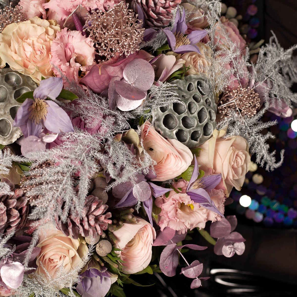 Необычный букет — подходящий вариант самобытного дополнения к подарку на Новый год или Рождество. За счет использования веточек аспарагуса плюмозуса, эвкалипта, фисташки и похожего на елочные ветви капса классические весенние цветы в пастельных оттенках превращаются в по-настоящему новогодние бутоны. Основа зимней композиции — эустомы, ранункулюсы, анемоны, клематисы, антуриум и скиммия, дополненные бежевыми и кремово-розовыми розами Эквадор, розами Россия, кустовыми пионовидными розами и шишками. Сочетание не нуждается в дополнительных украшениях, поэтому я советую отказаться от упаковки. Чтобы быстрее создать праздничную атмосферу, оформляйте заказ в любом размере на сайте.