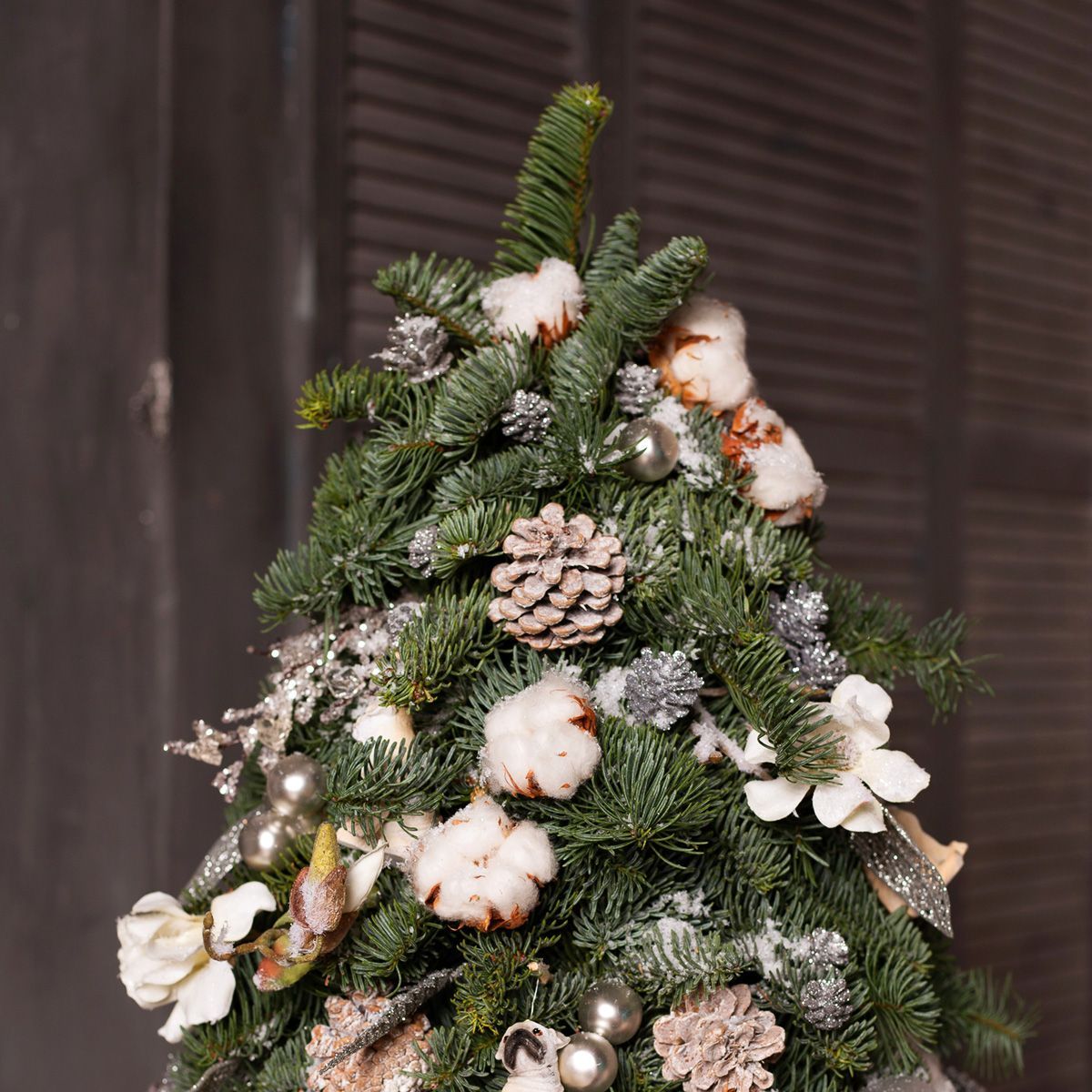 Создать новогоднюю атмосферу в квартире проще всего красиво украшенной елочкой — мы предлагаем выбрать композицию из нобилиса. На дереве размещены шишки, елочные украшения и хлопок, который своим беловатым оттенком и пушистостью ассоциируется с зимой. Своеобразный зеленый букет на Новый год или Рождество можно преподнести близким или поставить елку на столе в доме как альтернативу цветам в упаковке. Выбирайте подходящий для вашей комнаты размер по фото в каталоге. Чтобы получить подарок в день праздника, оформляйте заказ заранее.