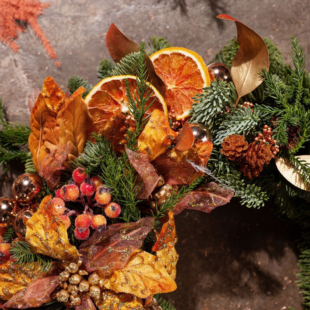 Новогодний венок для украшения дома к Рождеству и Новому году со стильным оформлением станет отличным подарком во время похода в гости к друзьям или при создании праздничной атмосферы в квартире. Букет из еловых веток нобилиса с добавлением эвкалипта гармонирует с декором в древесных оттенках: шишками, цитрусовыми, засушенными листьями и елочными игрушками. Интерьер заиграет новыми красками и будет намного наряднее, когда вы разместите украшение на двери или новогоднем столе. Купить зимнюю композицию можно, указав подходящий размер и оформив заказ на сайте.