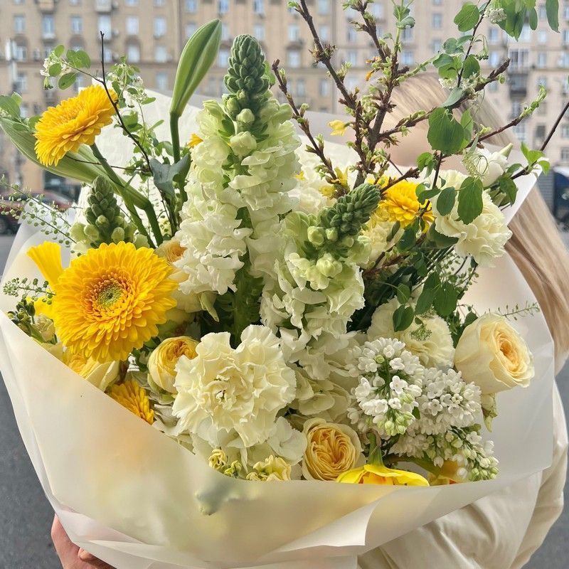 Элегантная и стильная весенняя композиция, способная произвести впечатление на любого получателя. Работа представлена в нежной солнечно-белой цветовой гамме. Оттенок - жизнерадостный, элегантный и романтичный. Благодаря грамотному подбору растений, каждый элемент этого букета приковывает внимание: белоснежная сирень с мелкими соцветиями, стильные мини-герберы, неожиданно гармонично вписавшиеся в работу гвоздики, элегантные розы кремового оттенка в сочетании с эустомой. Благодаря внушительному объему, композиция идеально подходит для солидных, запоминающихся поздравлений к торжествам самого высокого уровня.