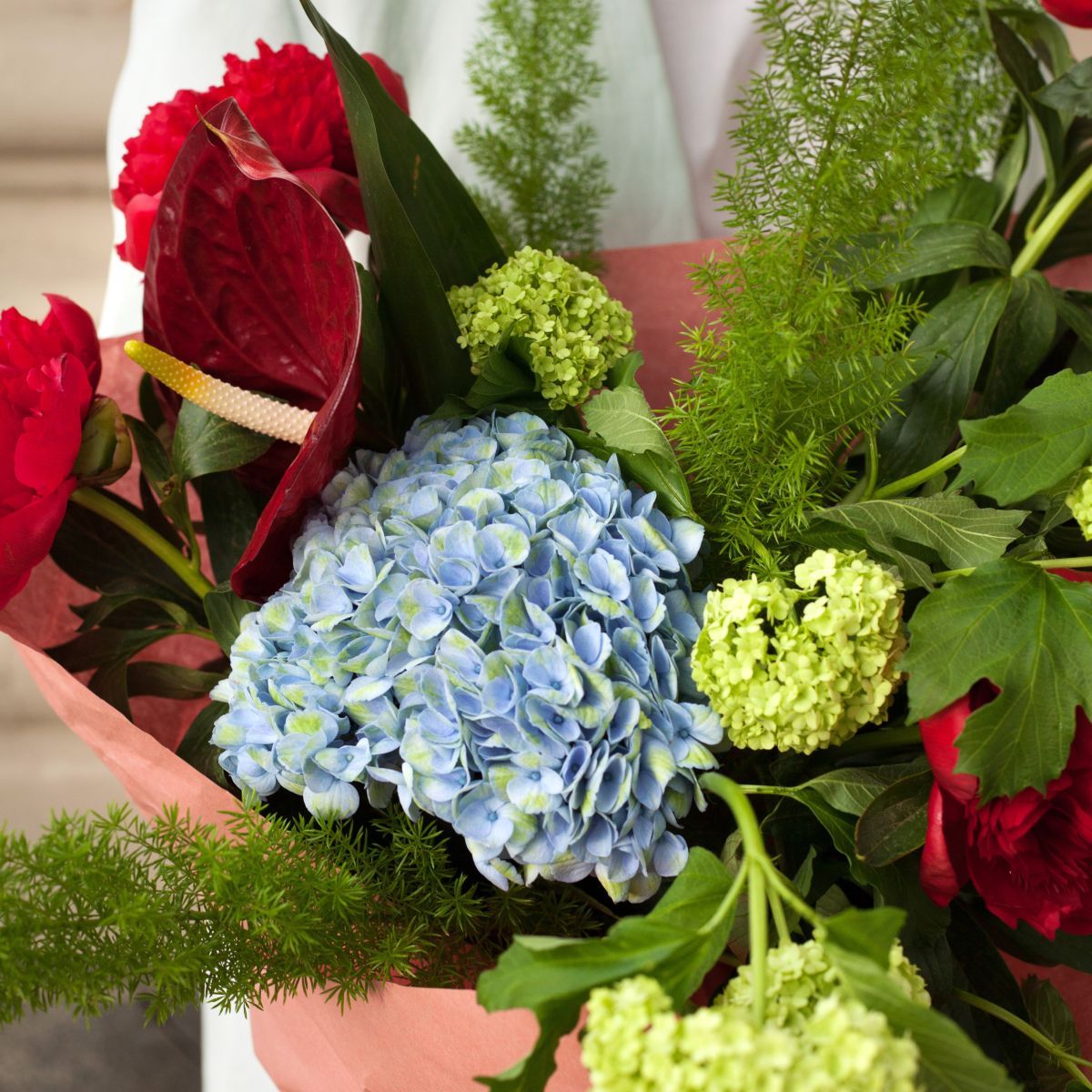 Яркий, эффектный и колоритный букет, который гарантированно украсит собой любой праздник, мероприятие, важное торжественное событие. Главный акцент работы – потрясающие объемные бутоны пионов насыщенно-красного цвета. Контрастом для них стали нежные шарообразные соцветия вибурна сочного зеленого оттенка, роскошная небесно-голубая гортензия. Отличный вариант небанального букета с оригинальное, нетипичной цветовой гаммой. Достойный выбор для ценителей смелых флористических решений и креативных современных дизайнов.