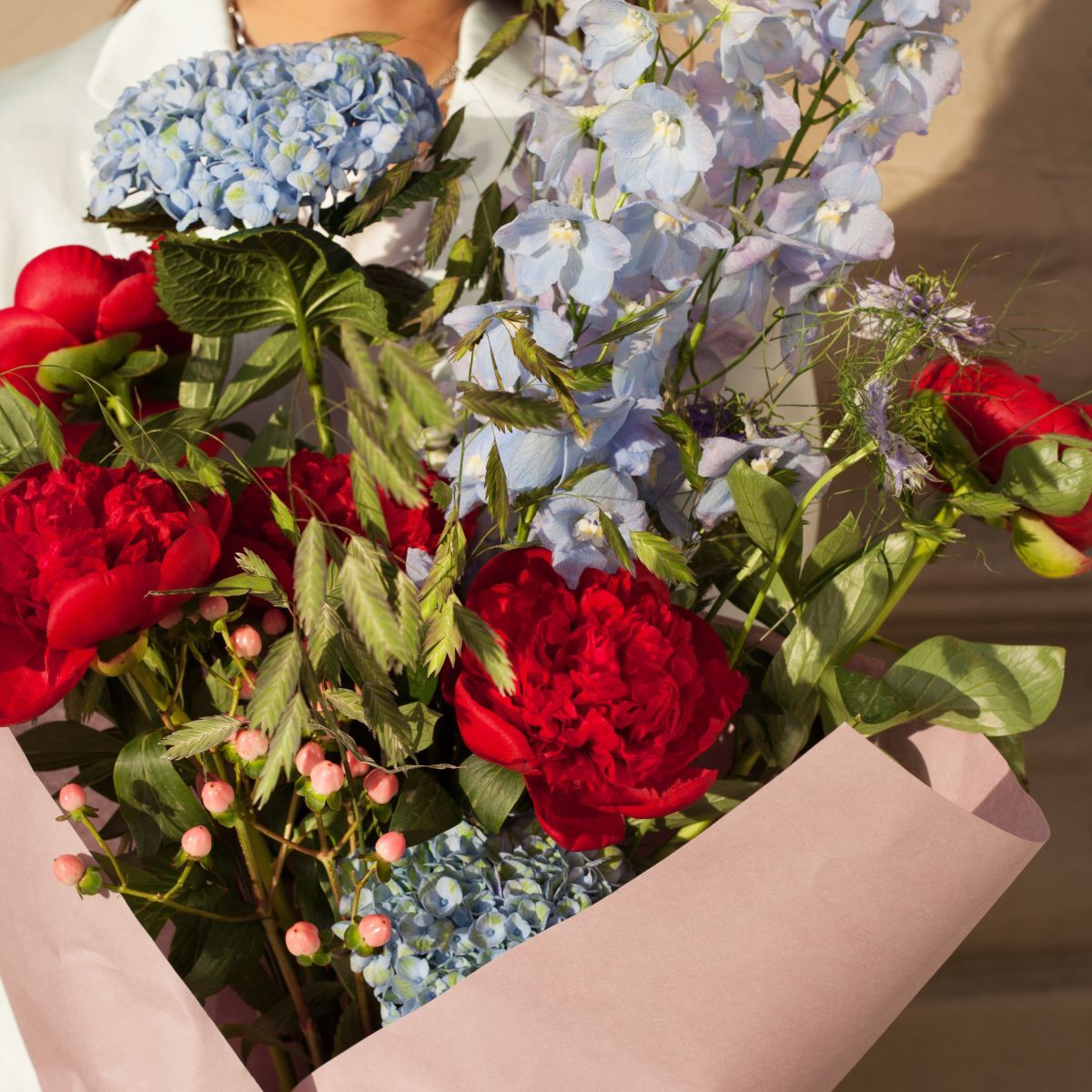 Изящный и нежный букет в оригинальном стиле, подкупающий креативным сочетание цветов, смелыми цветовыми акцентами. Это работа, в которой гармонично дополняют друг друга ароматные пионы, роскошные соцветия гортензии, эффектный, величественный дельфиниум, грациозная нигелла, очаровательный гиперикум. Дополнительный колорит букету придают декоративные колоски – пеннисетум. Достойный вариант стильной, колоритной цветочной композиции, которая станет великолепным украшением любого торжества, мероприятия или важного события.
