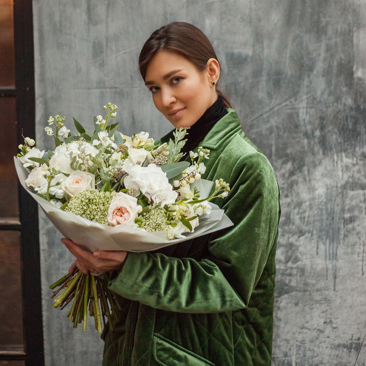Вспоминая о весне, многие представляют объемные сады, насыщенные оттенки природы и романтичные весенние бутоны. Все ассоциации о прекрасной поре воплотились в букете из гортензий и маттиол, роз и фрезий, альстромерий и снежноягодника с зеленью трахелиума и эвкалипта. Композиция подойдет для признания в чувствах любимой девушке и станет отличным подарком на День рождения. Воздушные женские цветы подчеркнула белая матовая упаковка, а открытка в дополнение от нашего интернет-магазина — повод для мужчины написать пожелания в день праздника. Универсальным считается сочетание в размере, как на фото, по указанной цене. Но вы можете купить мини-вариант или оформить заказ в объеме XL.