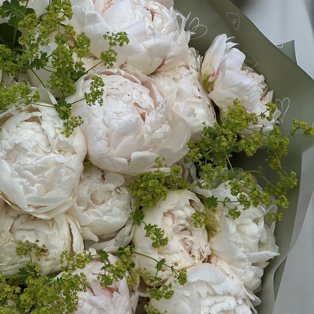 Изящный, нежный, очаровательный букет, представленный в торжественной белоснежной цветовой гамме. Основа композиции – роскошные белые ажурные пионы, которые идеально впишутся в любой формат торжества и станут достойным его украшением. Крупные ароматные бутоны формируют эффектное цветочное облако, стильные украшением которого выступает экзотическая алхемилла. Достойный выбор для поздравлений, комплиментов, знаков внимания без повода. Удачная альтернатива любым другим цветам с акцентом на современный стиль во флористике и тренды в ней.