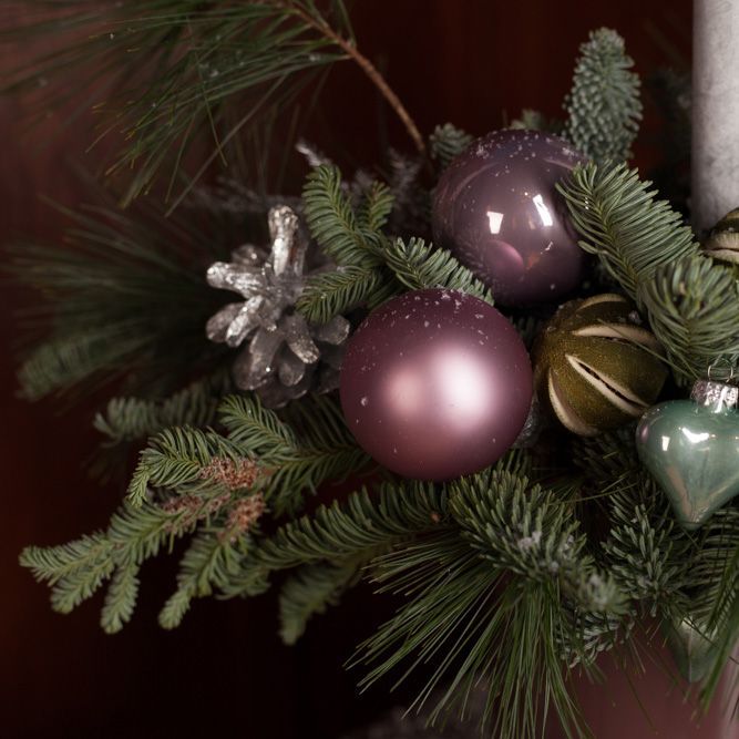 Новогодняя композиция из веток лапника, сосны и аспарагус плюмозуса — хороший вариант для замены елки или как дополнительное украшение дома, которое создаст праздничное настроение всем членам семьи. Зимний букет в керамической упаковке завершают елочные игрушки, шишки и свечи — идеальное сочетание в сливово-серебристых оттенках, которое можно поставить на семейный стол вместо цветов. Зажгите огонь и насладитесь беседой на Рождество и Новый год, когда так важно уделить время близким. Если выберете этот ансамбль в качестве подарка, оформляйте заказ заранее в нужном вам размере, чтобы получить презент к выбранной дате.