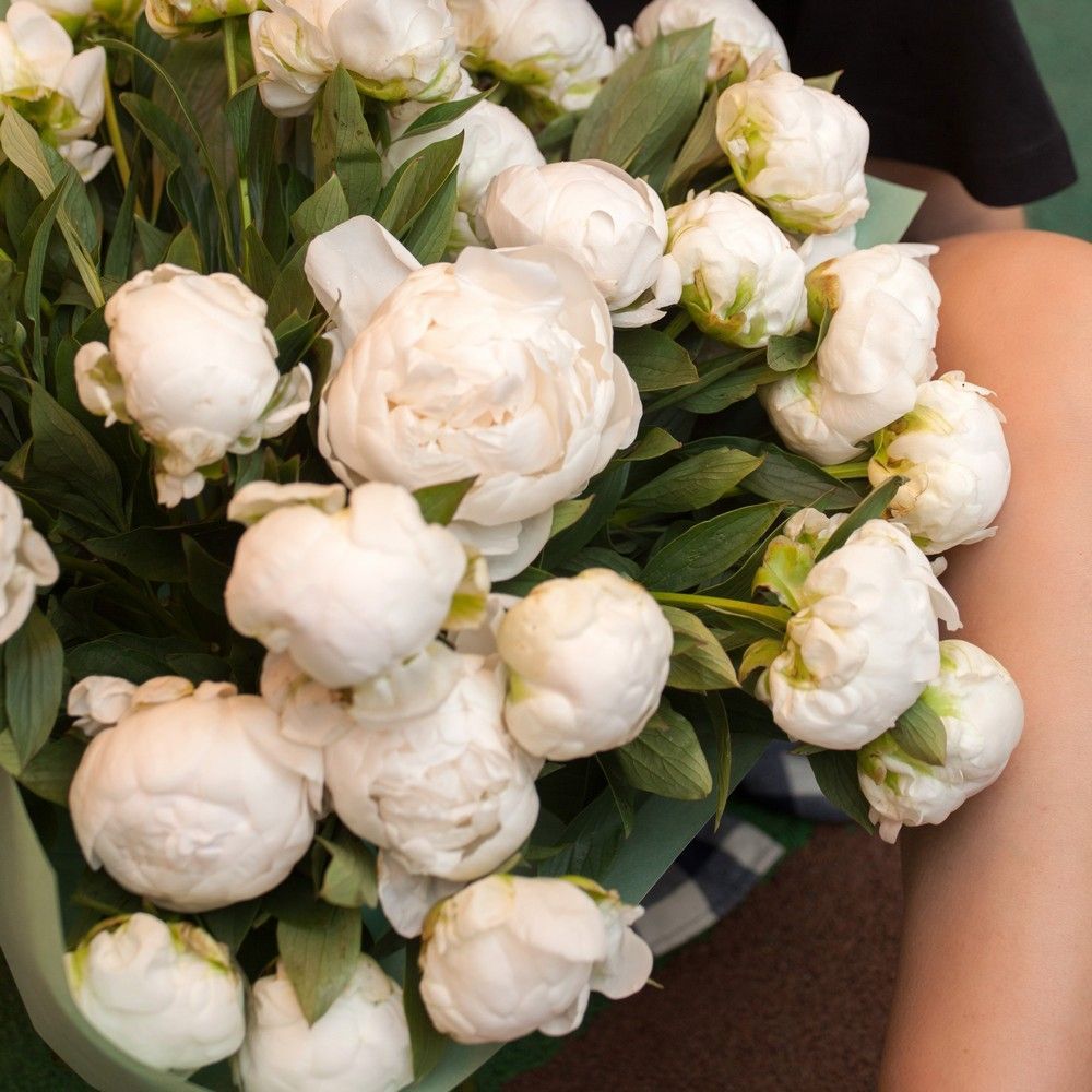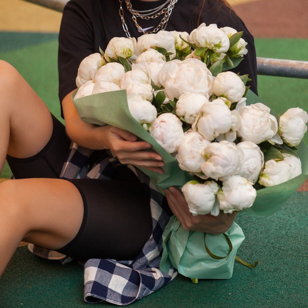 Потрясающий, нежный, элегантный и стильный букет из роскошных белоснежных пионов – выбор, который гарантированно произведет впечатление и надолго останется в памяти получателя. Особенно интересно и презентабельно композиция выглядит в оформлении благородного насыщенно-бирюзового оттенка, на фоне которого сочные бутоны приобретают дополнительный лоск и натуральный шарм. Благодаря универсальной цветовой гамме букет гармонично впишется в любой формат и стиль торжества, достойно украсив его колоритным акцентом.