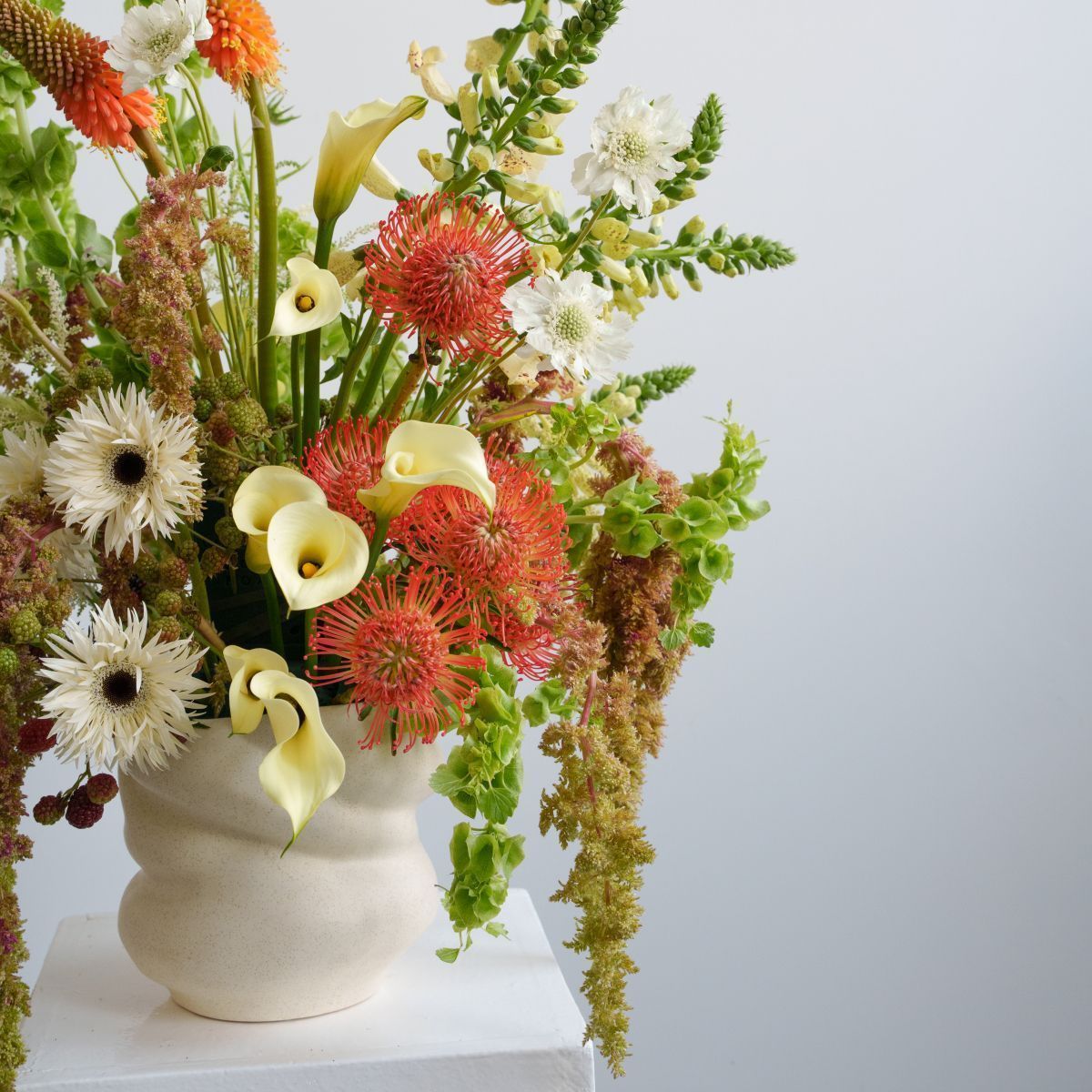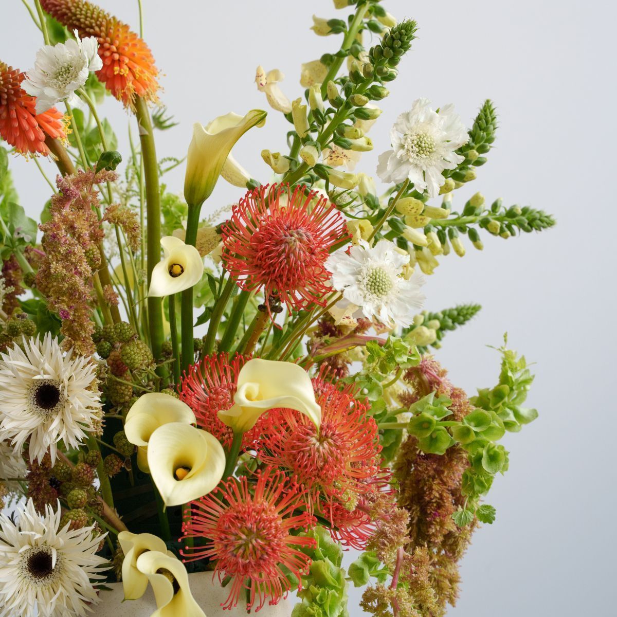 Бархатные каскады амаранта, гладкая элегантность калл, солнечные диски гербер и пушистые "лапы" анигозантуса создают динамичный контраст. Игра фактур и линий: струящиеся формы против строгой графики. Символ энергии, радости и смелого вкуса. Идеально для творческих натур и ярких праздников. Долговечный, незабываемый акцент интерьера или подарок.