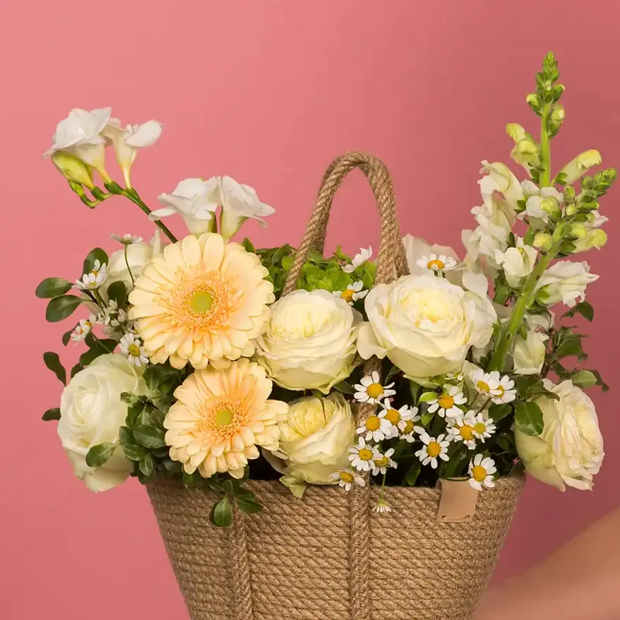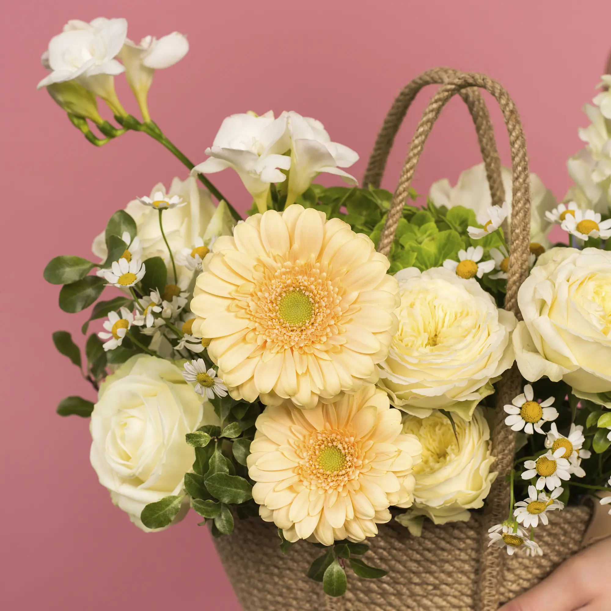Корзинка с ромашками, розами и гортензией №2409 среднего размера